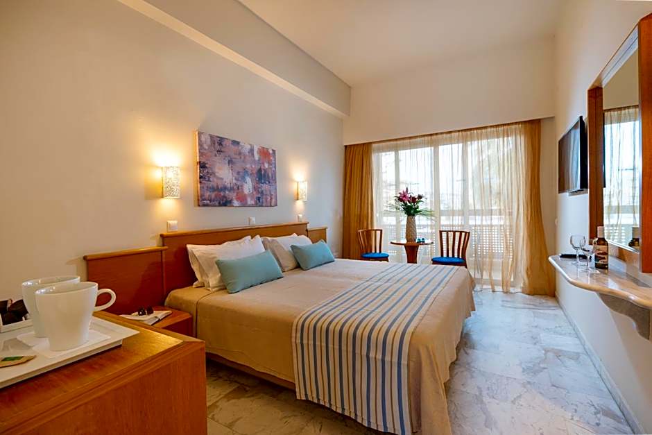 Just from the heart of Rethymno, this four‑star retreat blends island charm with family‑friendly fun. A waterslide, a free water park, and a free kids’ club add splashy appeal, while a garden setting, sun deck, and even live music in the evenings help create a relaxed, vacation‑mue vibe.